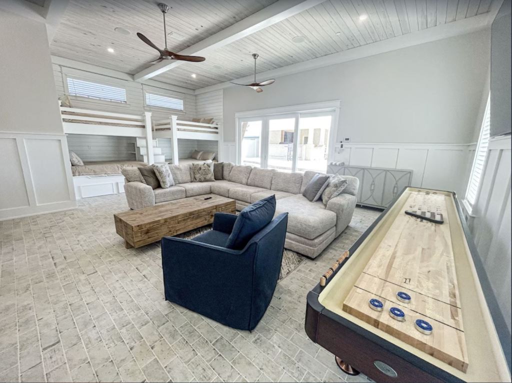 **1st Floor BunkBed/Rec Room offers 4 Queen Size Bunk Beds with private bathroom. This room opens up to the Pool/Outdoor area.